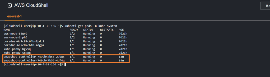 use the kubectl get pods -n kube-system command to confirm that the pull from the git repository was successful and the snapshot controllers were successfully installed and are running.