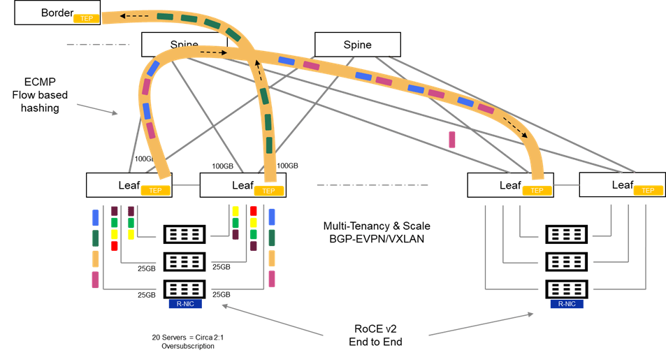 • Almost ubiquitously, ECMP (Equal Cost Multipath Routing), which is a hash-based mechanism of routing flows over multiple equally good routes is leveraged. This allows the network, over time, load balance effectively over all available uplinks from leaf to spine and from spine to leaf.
