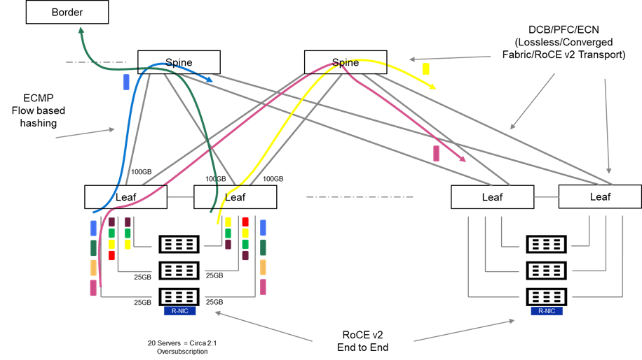 • The fabric may be oversubscribed at of a ratio of 2:1 or even 3:1. In other words, I may have 20 servers in a physical rack, served by 2 Top of Rack Switches (TOR). Each server connecting at 25Gbps to each TOR. (Cumulative bandwidth of 500GB). Leaf to Spine may be configured with 2 X 100Gbps, leaving the network oversubscribed at a ratio of circa 2.5:1.