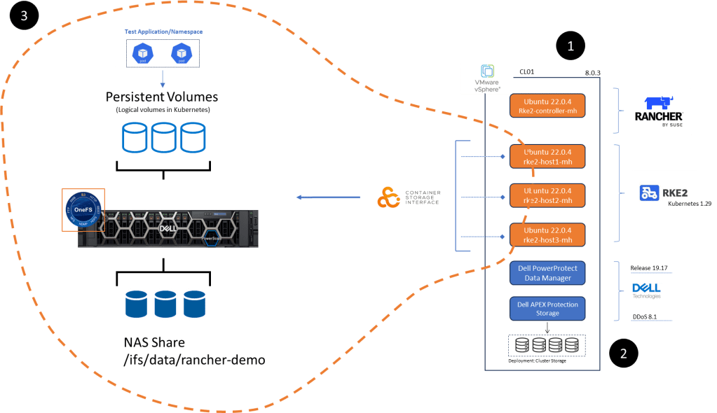 • Dell CSI (Container Storage Interface) for PowerScale installation and configuration on our pre-existing RKE2 cluster ( the one we configured in Part 1 of the series). We will point the cluster to write to Persistent volumes created on the PowerScale NFS share.