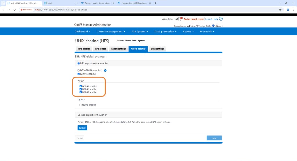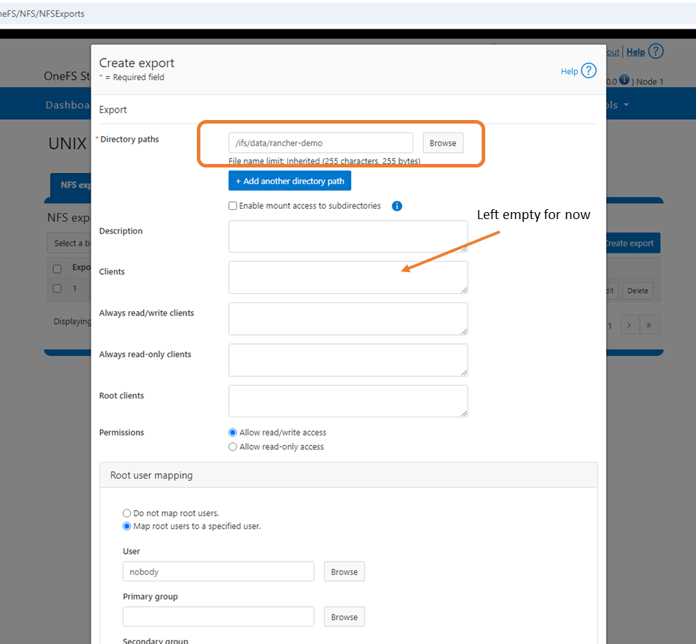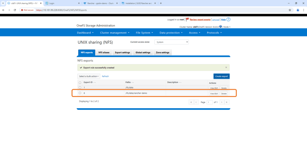 Create the export by adding the Directory Path /ifs/data/rancher-demo. Again this is a test environment, so I have left all my default settings as is. I also didn’t populate the clients tab, which will add another layer of access authorisation. By leaving blank we give everybody access. Scroll down and ‘Create export’.