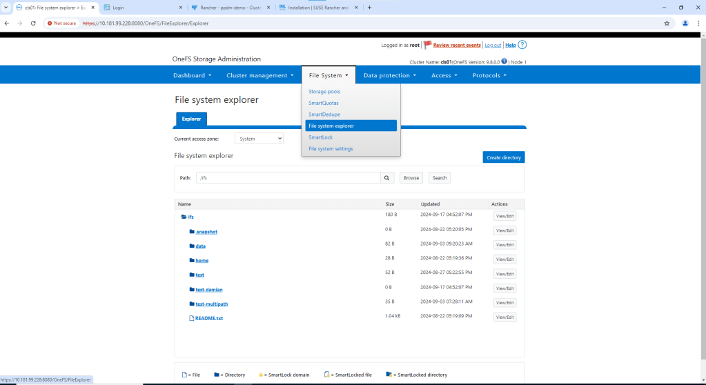 We can browse to the OneFS interface to see the folder created (note the same name as the PVC) and that data is being injected into the file ‘out.txt’.