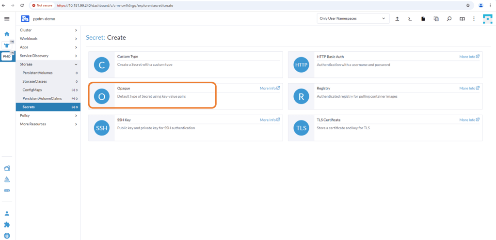 Delete, the pre-populated code and paste our snippet above. Notice you will get an error as we have not yet created our new namespace “dell-ppdm-demo”. You can very quickly do this with kubectl directly from the console.