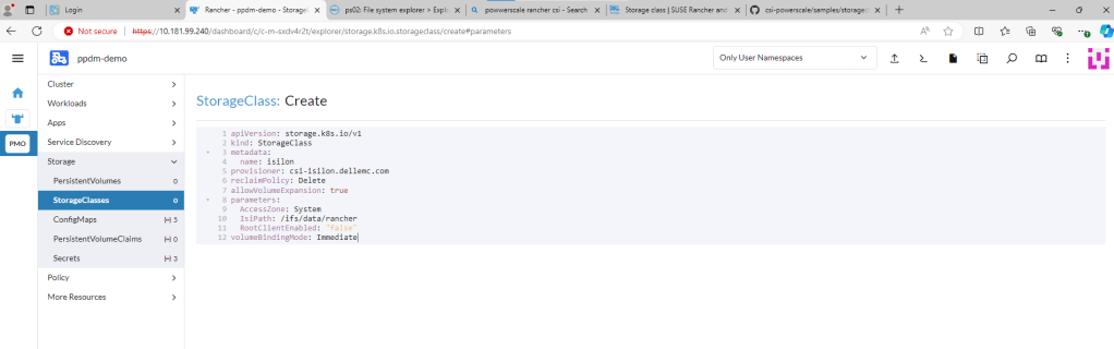 You can find the link to the sample storage class I configured here. For a bit of clarity I have redacted all the comments in the code. This is just a sample, you can change other parameters here such as the VolumeBindingMode etc. Just make sure the IsiPath matches the path configured in Powerscale.