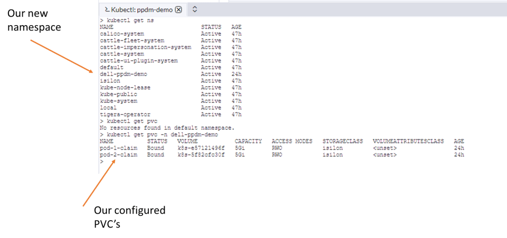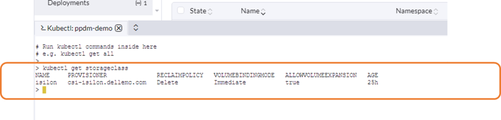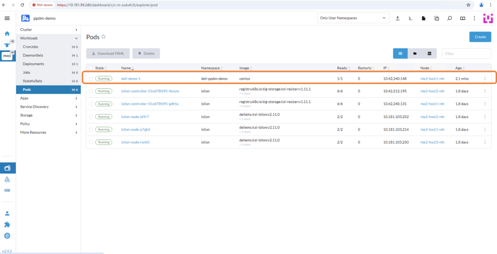 After a few seconds the Pod will deploy and you should see the following. Note, it is deployed in the ‘dell-ppdm-demo’ namespace.