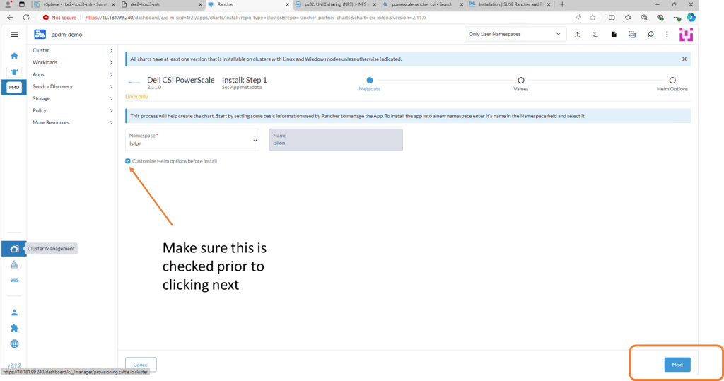 Check the ‘Customize-Helm Options before Install and then ‘Next’. We need to change the ISI Path in the YAML Manifest.