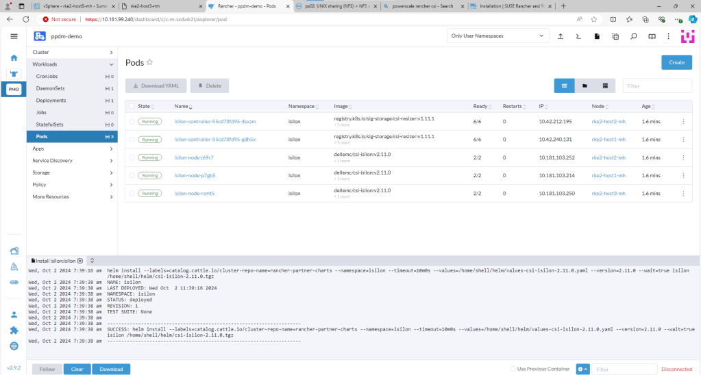 You can check this via Kubectl also by opening the Shell and running the ‘Kubectl get pods -n isilon’ command. All Pods should be in a Running state.