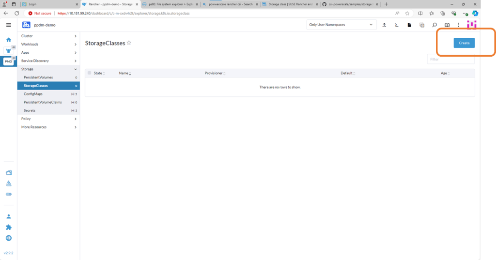 Navigate to the StorageClasses tab and click ‘Create’. We will run through this step on the video in part 4 also.