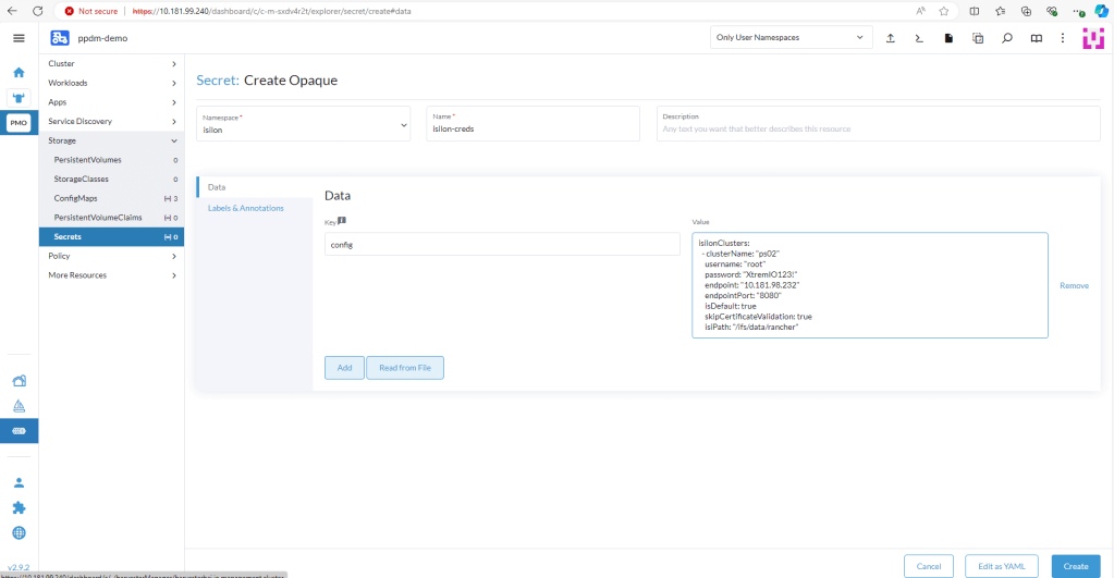 where the ‘Clustername’ is my Powerscale cluster name. The isiPath is my NFS share. Change the Data key to ‘config’ and click ‘Create’.