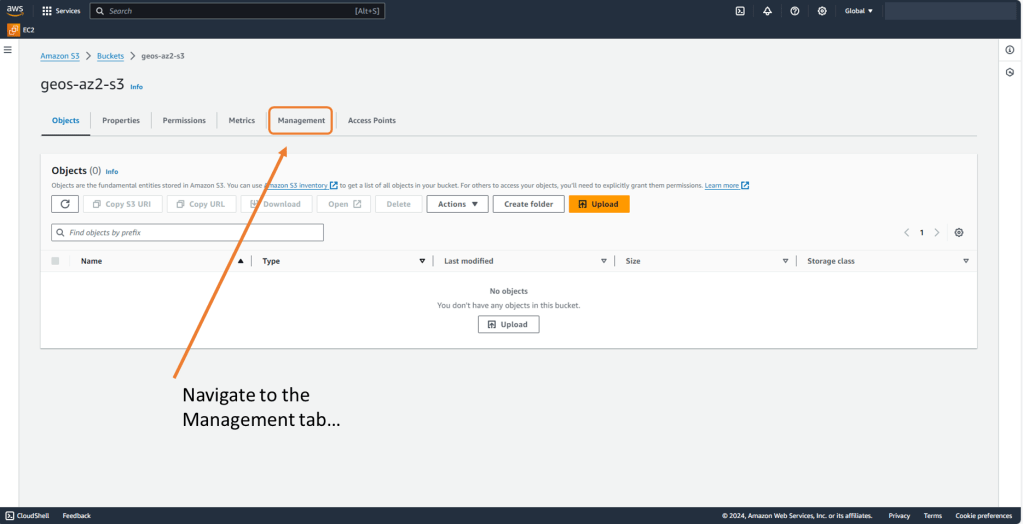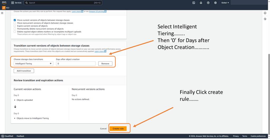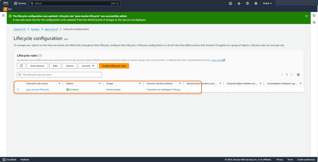 We can also apply filters to the policy to push only certain objects in the Intelligent Tier and other configure other lifecycle options. For now though we will keep it simple.